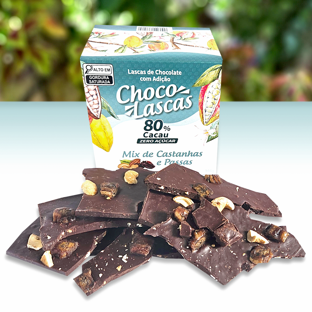Lascas de Chocolate 80% Cacau, Zero Açúcar, com Mix de Castanhas e Passas. Fabricado em Santa Teresa, Espírito Santo, utilizando um blend de amêndoas de cacau trinitário da Fazenda Olhos d'Água, de São João do Sobrado, em Pinheiros, norte do Espírito Santo.