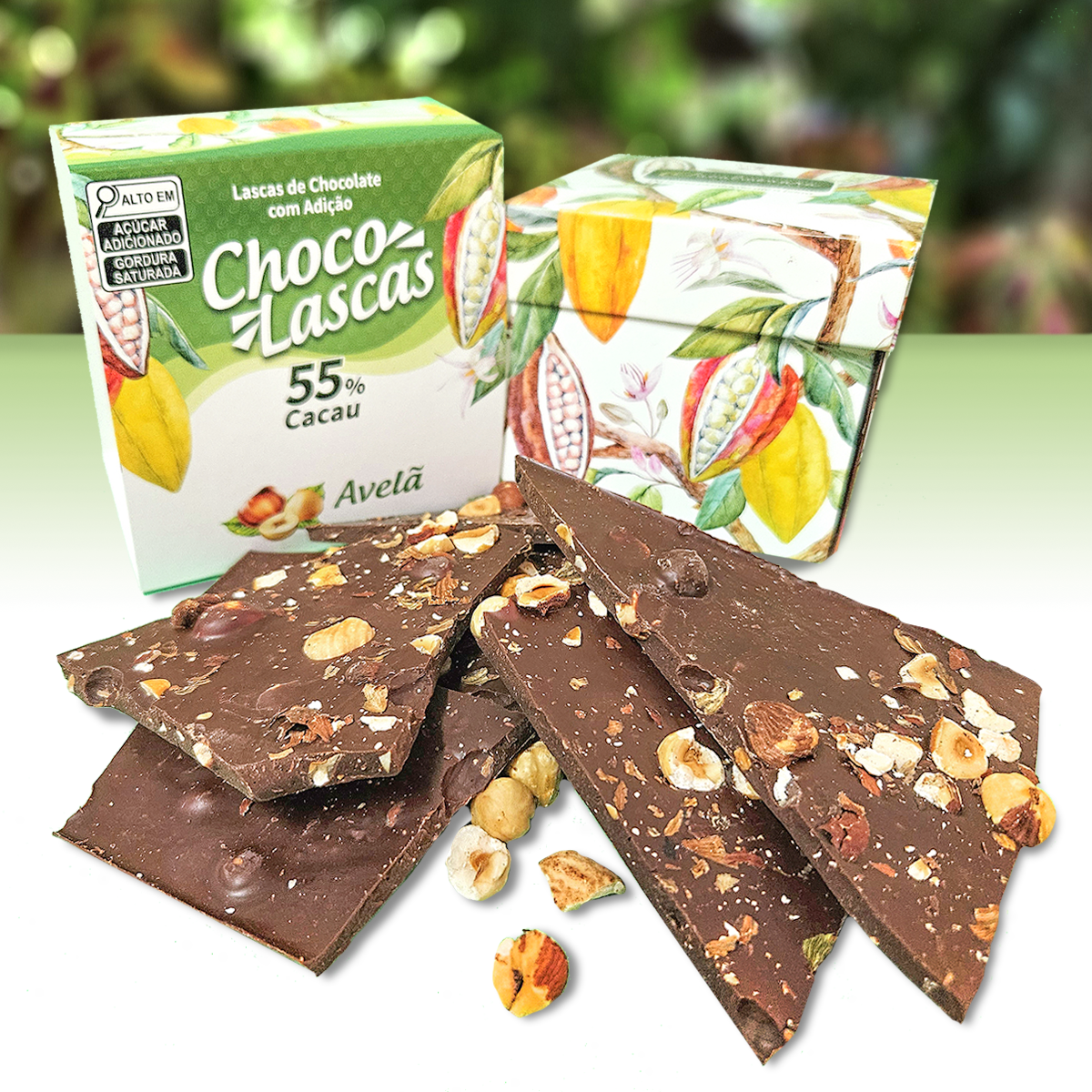 Lascas de Chocolate 55% Cacau com adição de Avelã. Fabricado em Santa Teresa, Espírito Santo, utilizando um blend de amêndoas de cacau trinitário da Fazenda Olhos d'Água, de São João do Sobrado, em Pinheiros, norte do Espírito Santo.