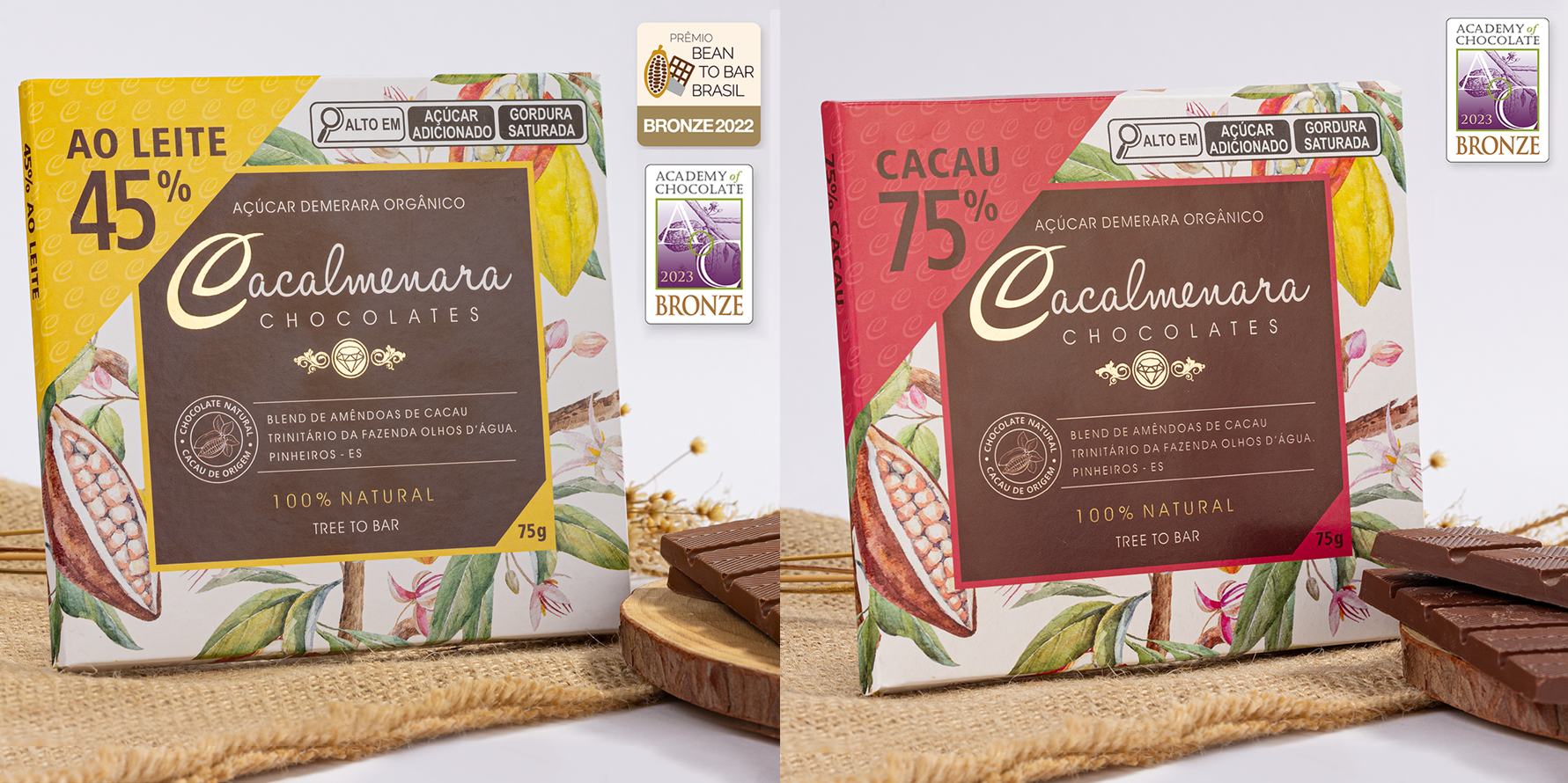 Nossos chocolates possuem premiação nos maiores concursos de chocolates naturais no Brasil e no exterior. No concurso da Academy of Chocolate de Londres de 2023, fomos Bronze com a barra de chocolate ao leite 45% cacau e com a barra de chocolate 75% cacau. No concurso nacional Prêmio Bean to Bar Brasil 2022 a barra de chocolate ao leite 45% cacau também foi premiada com a medalha de Bronze. Uma grande conquista representando o cacau brasileiro no Brasil e no mundo.