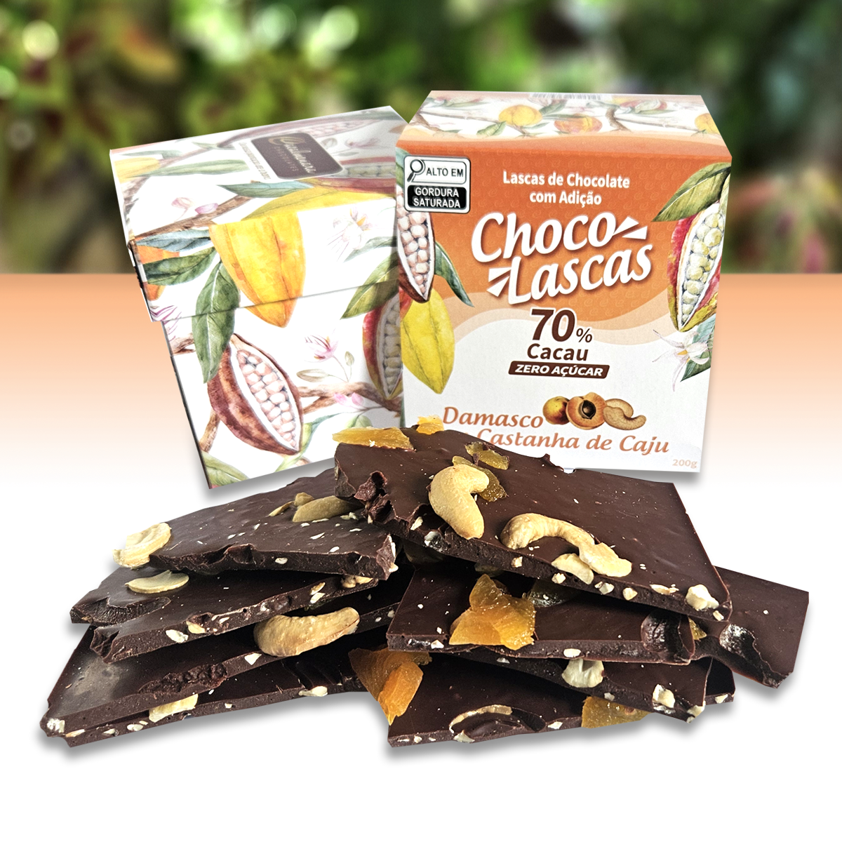 Lascas de Chocolate 70% Cacau, Zero Açúcar, com adição de Damasco e Castanha de Caju. Fabricado em Santa Teresa, Espírito Santo, utilizando um blend de amêndoas de cacau trinitário da Fazenda Olhos d'Água, de São João do Sobrado, em Pinheiros, norte do Espírito Santo.
